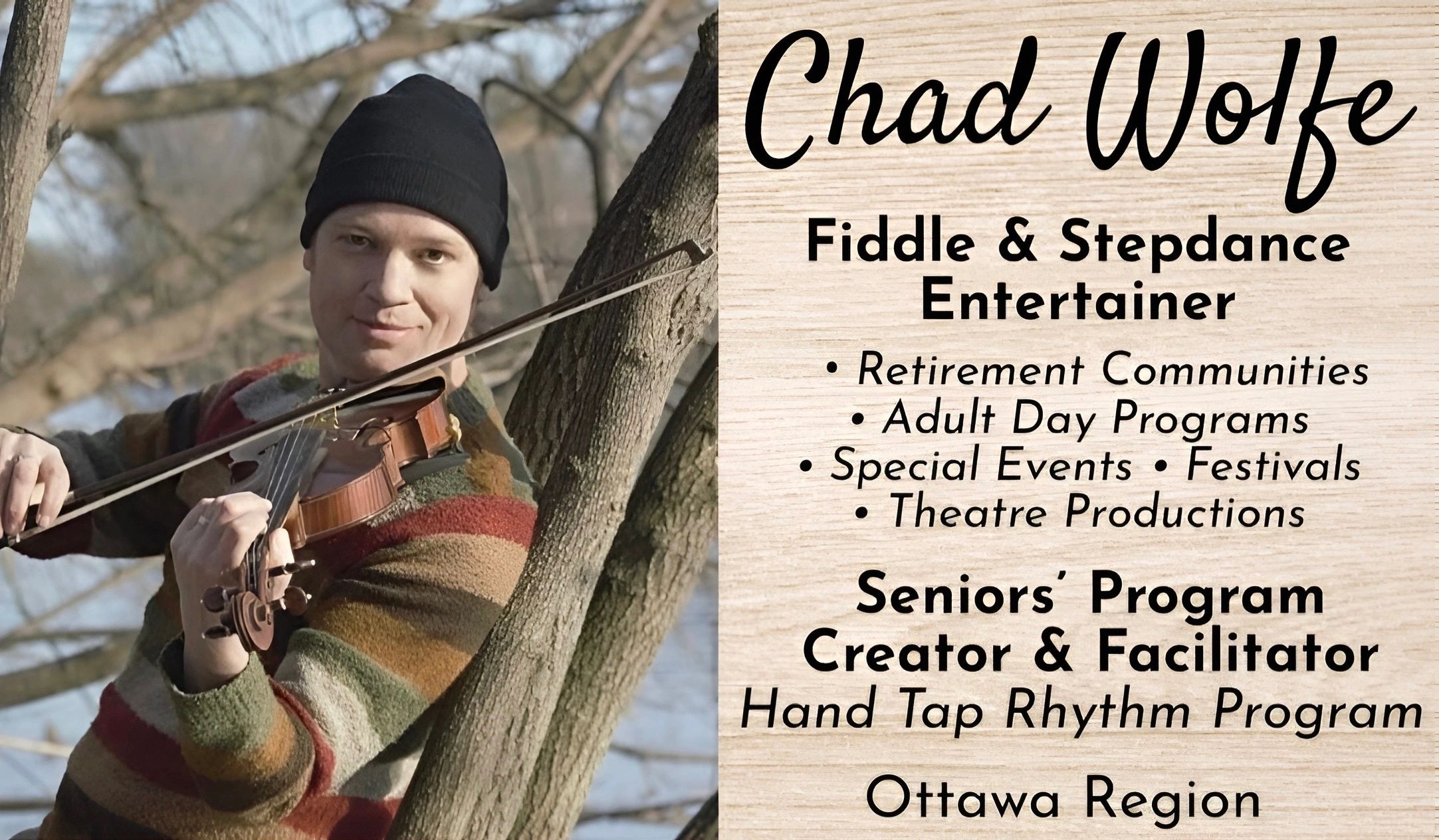 Today, Chad remains a vibrant presence on stages throughout the Ottawa region, performing full‑time for audiences in retirement communities, adult day programs, special events, festivals, and theatre productions. His shows blend dynamic fiddle music, stepdancing, and engaging storytelling—bringing the spirit of a variety of fiddle styles to life for audiences of all ages.